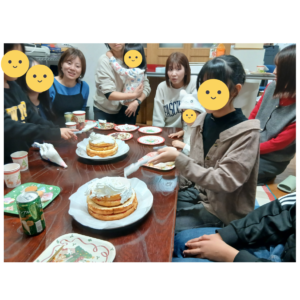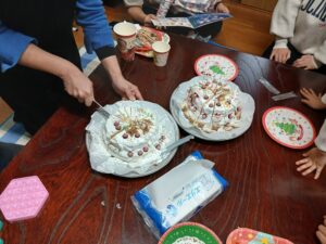 また、今年も子供達のために、「子供達がデコレーションをして完成するケーキ」を出してくださり、子供たちは大喜びで、全員でケーキ生地にクリームを塗り、その上にチョコを乗せたりして、大はしゃぎしてました!!