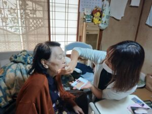看護師がO様に化粧をするなど、おめかしされ、ランチ会へ出発されました。